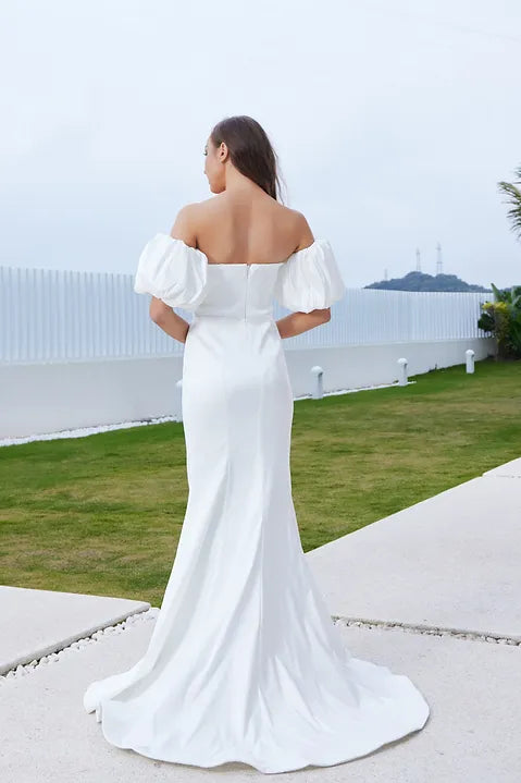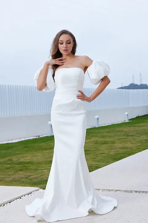 Elevate your wedding look with JA5014, a siren line gown in Luxe ivory. The removable sleeves add versatility, while the strapless design exudes sophistication. Make a statement on your special day with this luxurious and elegant piece.